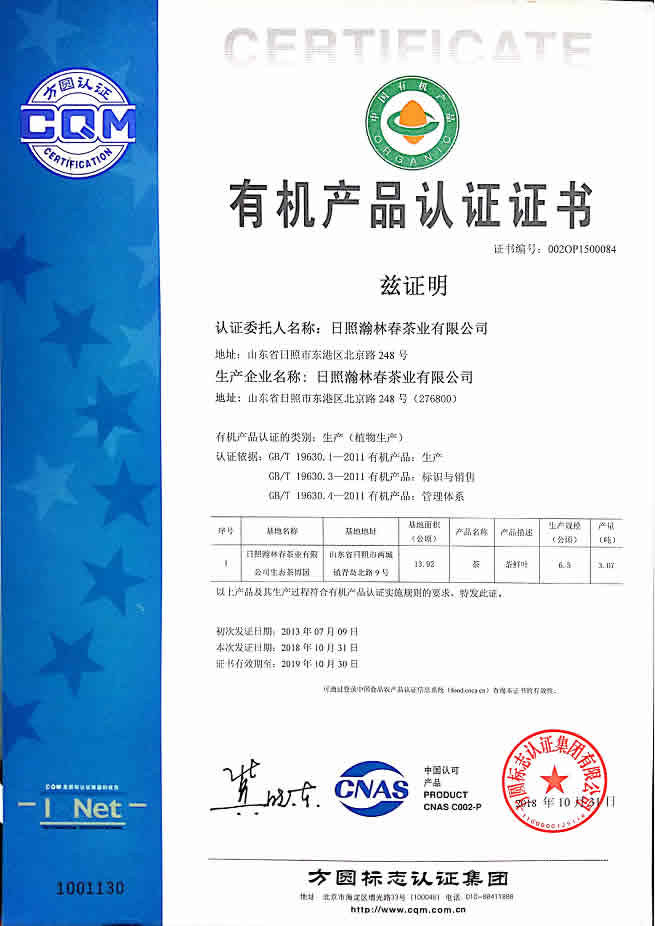 瀚林春-有机生产认证证书