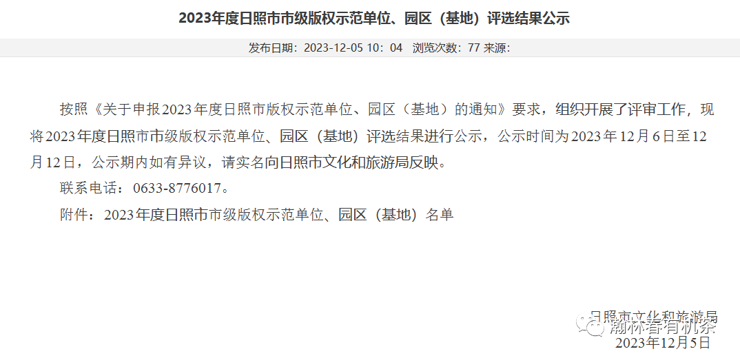 12月,瀚林春荣获2023年度日照市市级版权示范单位